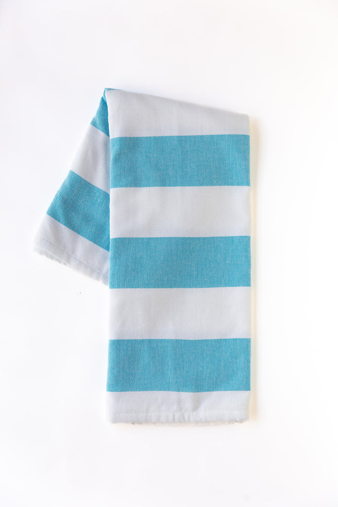 Featuring sky blue and white vertical cabana stripes and a premium woven, medium-weight Turkish cotton with a terrycloth lining, the Beach House Cabana Collection is a great option for customers who love the softness of Turkish cotton, but who prefer a terry feel as well.